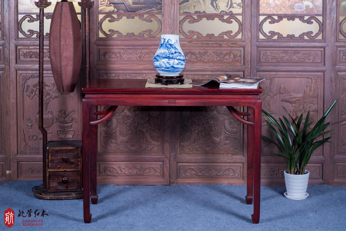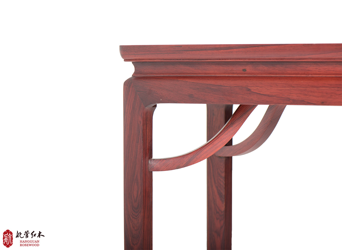 品鉴红木家具,要讲究形材意韵,不可偏废其一。亦须重拾经雅器的历史记忆,重现物我合一的造物文化。这一点,恰如航管红木家具所呈现的霸王枨条案。霸王枨是明清家具中桌案类器具常用的一种榫卯结构,霸王枨分别承担着支持力和拉力,因此霸王枨是其他榫卯结构所不能代替的。霸王枨因其力顶千斤似霸王举鼎而成名,但其安装位置确很隐蔽,一般都藏在牙板或花边后边,因此它又是极有内涵的构件)。