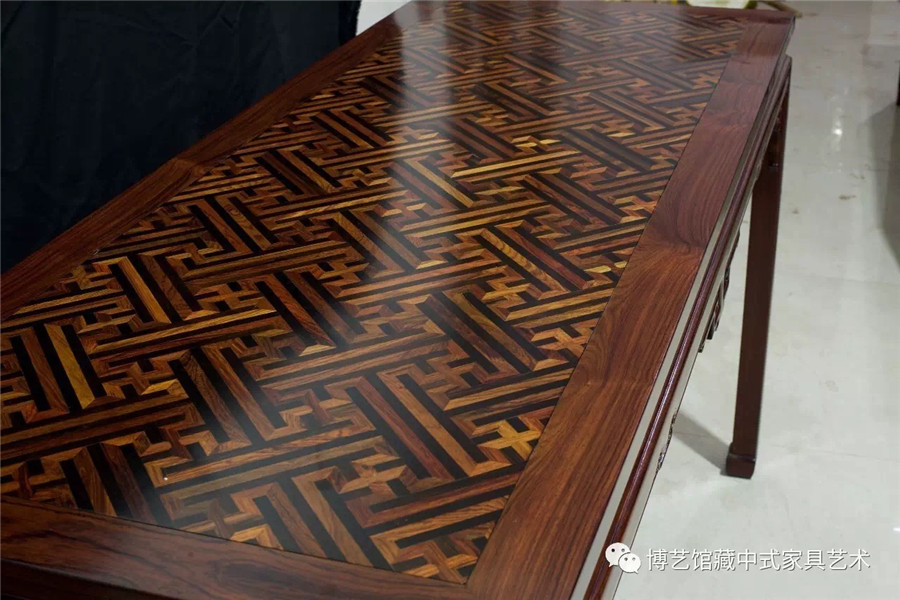材质;老挝红酸枝。 规格:159*62.5*85。 制作:4000之多的小方条的榫卯相接,攒成整版的万字不到头之锦地万字纹,耗费工时之大,考验技工技艺之精湛,结构之紧密。