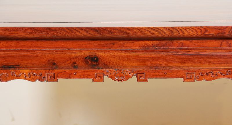 尺寸:105*36.5*82[厘米]      几面长方形,边缘起拦水线,几面下有雕拐子纹缩腰一圈,垂附在缠腰之上。腿足之间雕拐子龙纹花牙,方直腿,回纹马蹄足直落托尼之上。