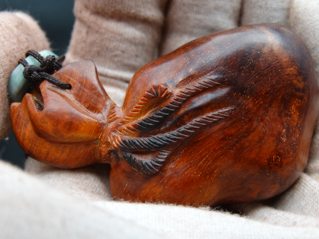 材质:印度小叶紫檀老料,木质细密,牛毛纹里充满紫檀素,一经上手盘玩,包浆混厚,黑里泛紫。